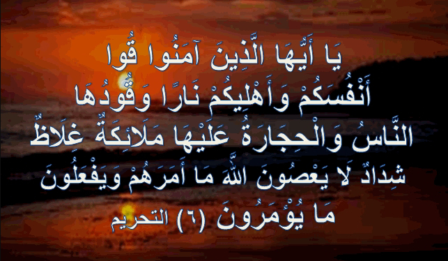 یٰۤاَیُّهَا الَّذِیۡنَ اٰمَنُوۡا قُوۡۤا اَنۡفُسَكُمۡ وَ اَهۡلِیۡكُمۡ نَارًا وَّ قُوۡدُهَا النَّاسُ وَ الۡحِجَارَۃُ عَلَیۡهَا مَلٰٓئِكَۃٌ غِلَاظٌ شِدَادٌ لَّا یَعۡصُوۡنَ اللّٰهَ مَاۤ اَمَرَهُمۡ وَ یَفۡعَلُوۡنَ مَا یُؤۡمَرُوۡنَ