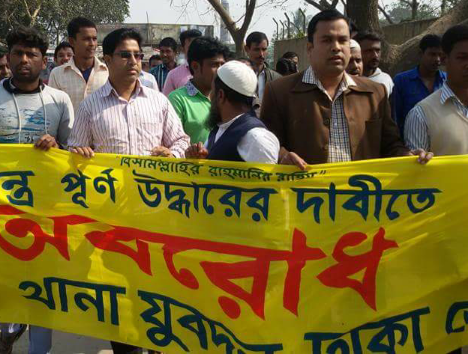 গণতন্ত্র পূনরুদ্ধার,নির্দলীয় নিরপেক্ষ তত্ত্বাবধায়ক  সরকারের অধীনে নির্বাচন,বিএনপি-জামাত সহ অন্যায় ভাবে আটক সকল রাজননৈতিক নেতৃবৃন্দের নিঃশ্বর্ত মুক্তি ও অবরোধের সমর্থনে বিক্ষোভ